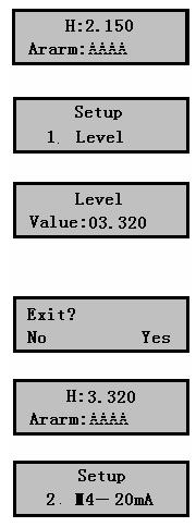 1)儀表上電,儀表進(jìn)入測量,液晶顯示液位數(shù)值,而實測液位為3.320m,下面介紹標(biāo)定方法。