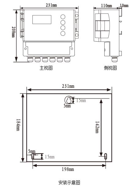 變送器背后有三個孔,尺寸如圖所示,其中上面的孔用于懸掛,下面兩個孔用于螺栓固定。