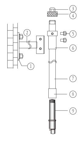 將安裝好的電極安裝管的套管裝入安裝在池壁上的支架托上,并用兩個M6螺栓固定。