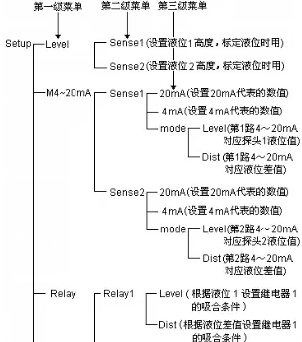 儀表出廠時,模擬4~20mA電流缺省設置為4mA代表0.000m,20mA代表儀表的可承受量程,如3.000m。用戶可以根據(jù)下面的設置步驟進行設置。