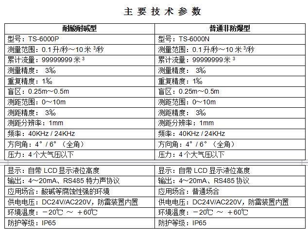 TS-6000型超聲波明渠流量計采用超聲波、以非接觸的方式測量明渠堰槽內的水位高度,再由微處理機自動換算出對應的流量值。儀表測流量時,液晶顯示瞬時流量及累計流量;測液位時則顯示液位及上下線報警指示。儀表采用了EEPROM數字存儲器,停電后可以確保儀器內數據不會丟失。