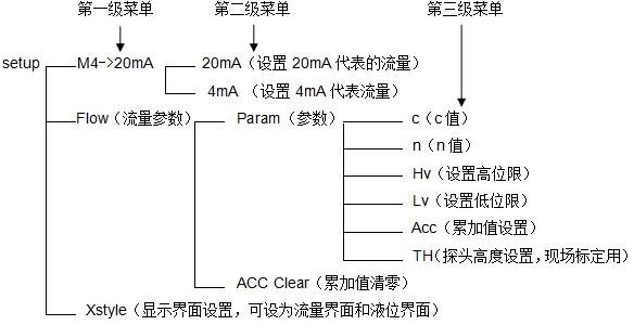1) 在儀表正常工作時點Mode鍵進入參數設置菜單后點▼鍵選擇到Flow流量參數菜單。