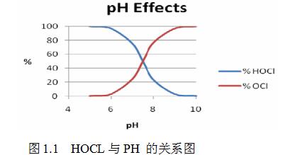 當氯的溶解于純水時,它自動水解為兩種物質(zhì):次氯酸HOCL 和次氯酸根CLO-,其溶解性曲線見圖1.1。