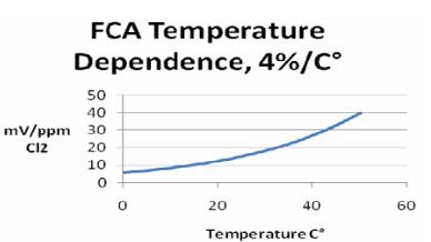 當PH 值在6-9.5 之間時,對樣品自動進行精確補償??刂迫芤篜H 值,不再需要昂貴的樣品調(diào)節(jié)系統(tǒng)。溫度變化也會影響余氯的測量,內(nèi)置的溫度傳感器可自動溫度補償(溫度變化與余氯值關(guān)系曲線見下圖)。