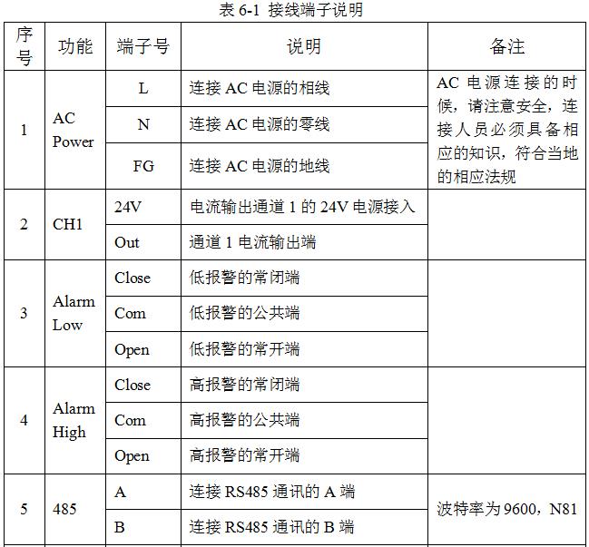 儀表的接線端子如下圖,各端子的意義如下表6-1說明: